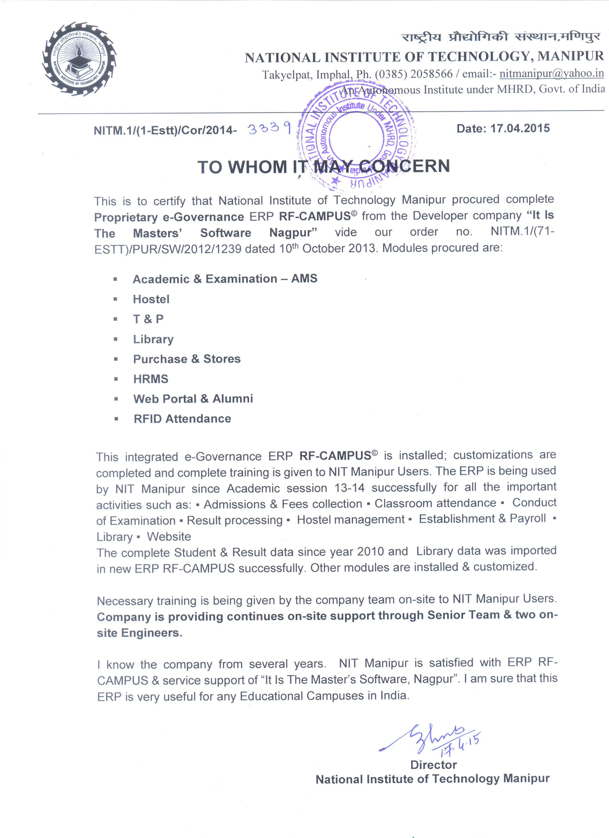 The company customized/developed ERP for e-governance of out NIT campus in modules such as admissions, academic, examinations & results, payroll and library etc. to be used by NIT Agartala in day to day activities the performance of which is found satisfactory. They are also providing necessary service support, whenever necessary.